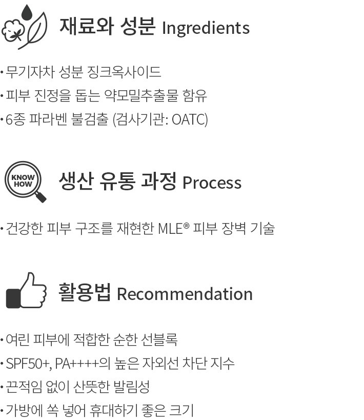 ・향:인공 향료를 첨가하지 않아 선블록 본래의 향이 은은하게 느껴집니다.