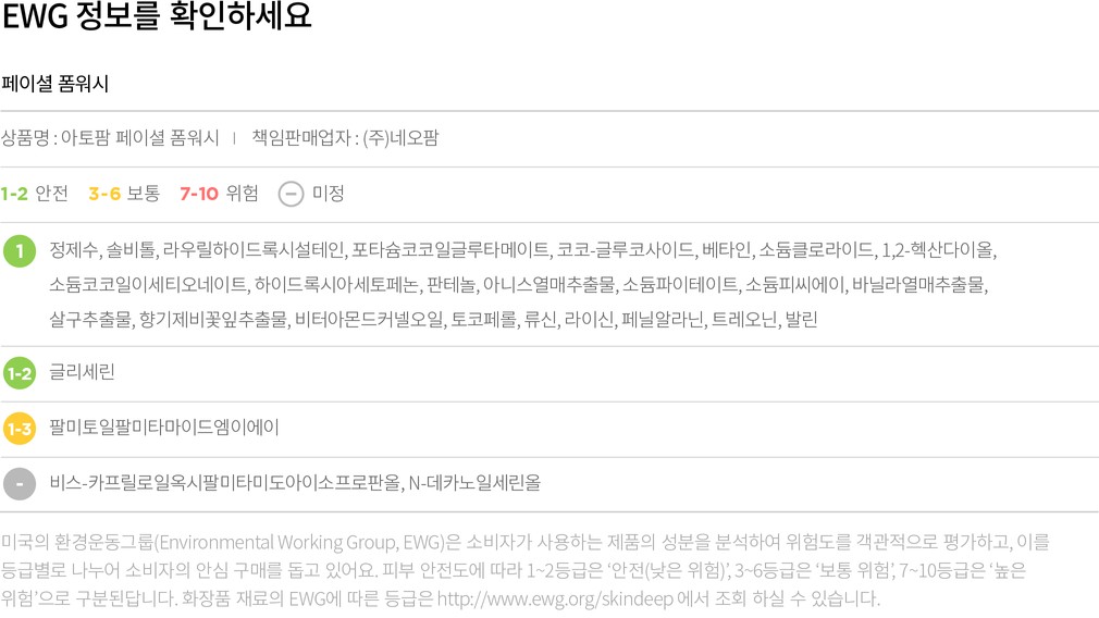 컬리는 EWG로부터 보통,위험 등급을 받은 성분이라 하더라도 숨기지 않고 정직하게 공개합니다. 더불어 우려되는 성분에 대한 정보를 함께 제공해 드리오니 구입 전 반드시 확인해 주세요.