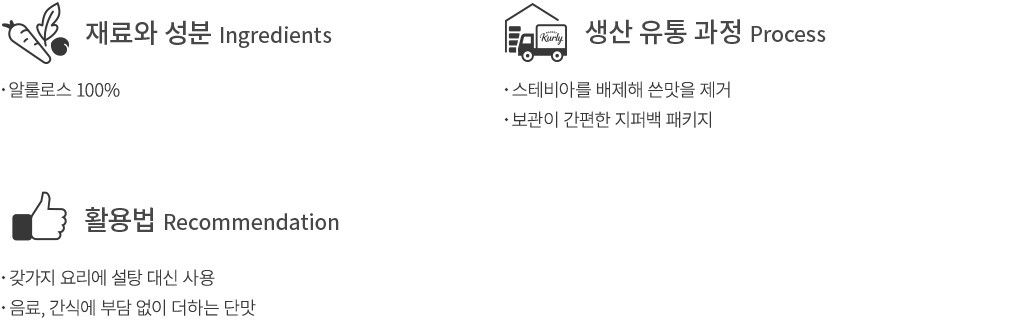 ・특징 :분말 형태의 알룰로스예요. 물에 잘 녹는 고운 입자를 지니고 있어,음료,간식 그리고 요리 등에 간편하게 사용할 수 있답니다.