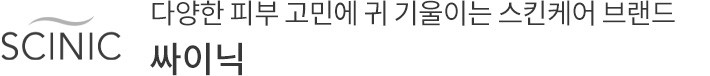 싸이닉(SCINIC)은 건강한 피부를 가꾸는 한 방울의 힘을 믿어요. 자연에서 찾은 원료에 과학의 힘을 더해 다양한 피부 고민을 관리해주죠. 뿐만 아니라 빠르게 변하는 뷰티 트렌드를 분석하고 고객의 목소리에 귀 기울이며 합리적인 가격대의 제품을 선보이고 있어요. 이러한 노력을 바탕으로 여러 뷰티 어워드를 수상하며 많은 사랑을 받고 있습니다.