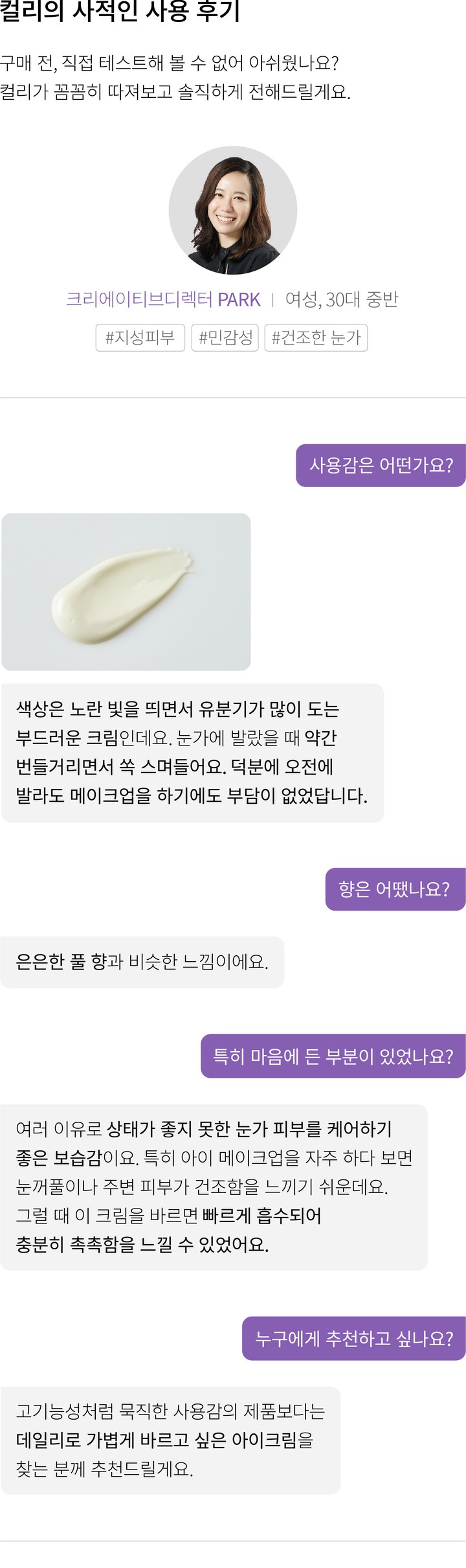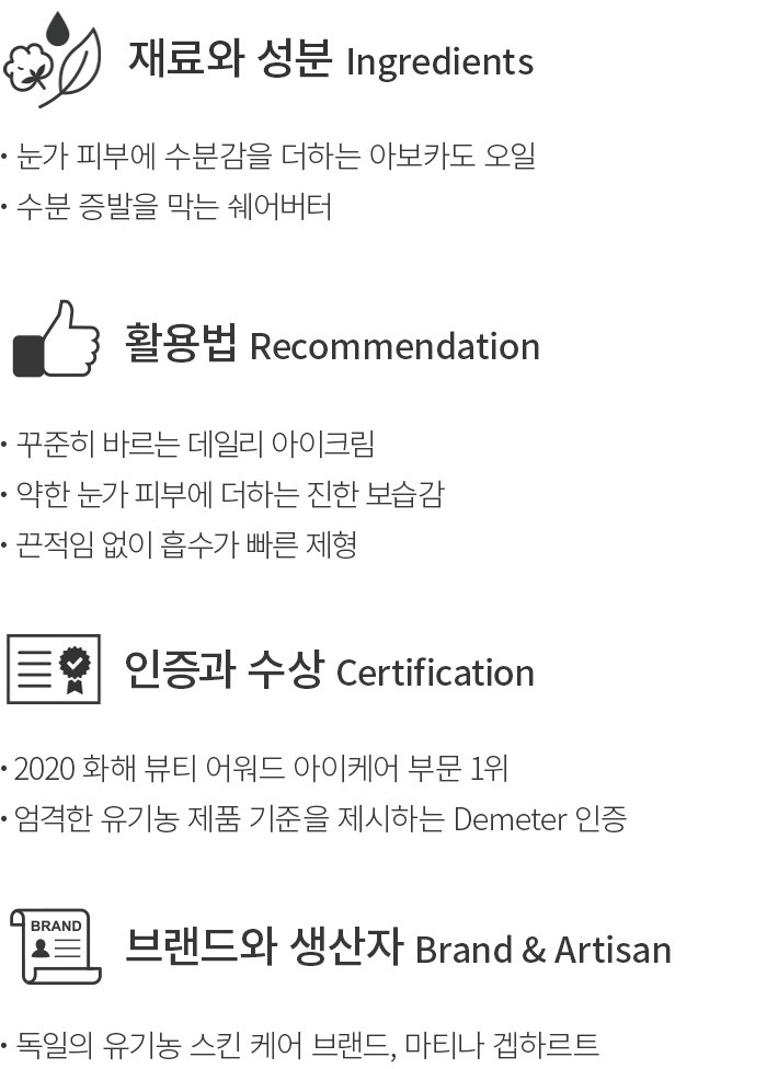 섬세하게 다뤄야 하는 눈가에 아보카도 아이크림을 콕콕 찍어 발라보세요. 원료부터 꼼꼼하게 신경을 기울여 만든 제품인데요. 크림에 함유된 아보카도 오일이 진한 보습을 더하며 눈 밑을 부드럽게 케어하고요. 쉐어버터 성분은 촉촉한 수분감이 오랫동안 느껴지도록 도와준답니다. 눈가 피부가 건조해서 당김을 자주 느끼는 분에게 매일 조금씩 사용해 볼 것을 추천 드릴게요.