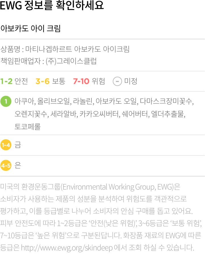 컬리는 EWG로부터 보통,위험 등급을 받은 성분이라 하더라도 숨기지 않고 정직하게 공개합니다. 더불어 우려되는 성분에 대한 정보를 함께 제공해 드리오니 구입 전 반드시 확인해 주세요.
