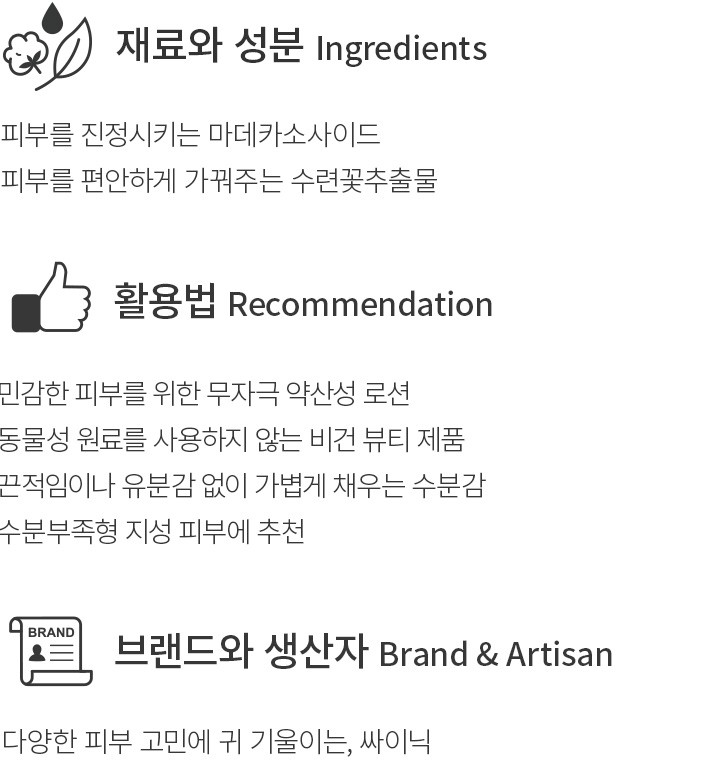 민감하고 고민이 많은 피부일수록 꼭 필요한 성분만 담은 깔끔한 기초 제품을 권할게요. 싸이닉이 선보이는 더 심플 데일리 로션의 성분은 총 열 몇 가지 남짓입니다. 피부에 부담을 주는 복잡한 성분과 동물성 원료는 모두 덜어내고,목적이 명료한 성분만을 남겼죠. 피부에 부드럽게 스며들어 편안하게 진정시켜주니,이 외에 무슨 역할이 더 필요할까요. 넉넉한 용량으로 준비했으니 피부에 아낌없이 발라보세요. 화장품을 꼼꼼하게 따져보는 사람들이 수년 간 1등으로 꼽은 로션인만큼 더욱 믿고 선택할 수 있을 거예요.