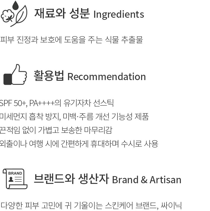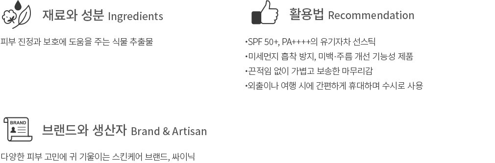 가볍고 보송한 마무리감을 자랑하는 싸이닉의 슈퍼 액티브 에어리 선스틱을 소개할게요. SPF 50+,PA++++의 든든한 자외선 차단력을 지녀 야외 활동 시에도 안심이고요. 미세먼지 흡착까지 막아주니 더욱 마음에 들죠. 한 손에 쏙 들어오는 아담한 크기로 간편하게 휴대하며 수시로 덧발라주기 좋아요. 자극 없이 순한 제품이니 소중한 가족의 피부까지 완벽하게 보호해주세요.