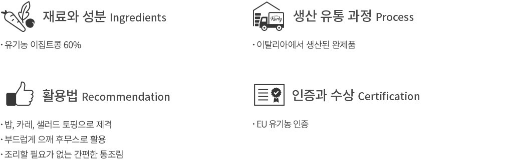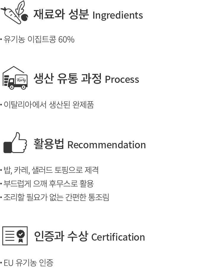 건강한 라이프스타일을 추구하는 이탈리아 브랜드,구스토사노가 선보이는 유기농 이집트빈을 소개합니다. 이집트빈은 부리가 튀어나온 병아리와 비슷한 모양을 하고 있어 병아리콩이라고도 불리는데요. 달콤하고 고소해 어떤 요리에 넣어주어도 조화로운 맛을 자랑한답니다. 구스토사노는 유기농 이집트빈만을 엄선한 뒤,정제수에 깨끗하게 담아 완성한 통조림을 준비했어요. 불리거나 삶는 번거로운 과정 없이 간편하게 고소한 풍미를 즐겨보세요.