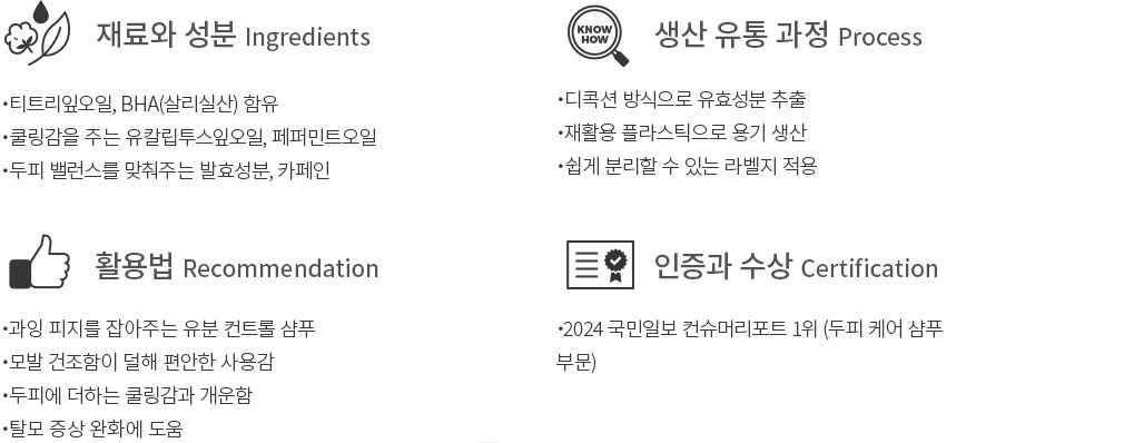 두피에 올라오는 과도한 유분을 시원하게 세정해주지만 모발을 건조하게 만들지 않는 샴푸를 찾는다면,아로마티카의 티트리 퓨리파잉 샴푸를 선택해 보세요. 과도한 피지를 조절하는 데 도움을 주는 티트리잎오일과 함께 페퍼민트오일,유칼립투스 유래 성분을 담아 사용감이 무척 개운한데요. 비오틴과 덱스판테놀 등 두피에 영양감을 주는 성분도 꼼꼼하게 채워 담았기에 두피가 마르는 느낌이 들지 않는답니다. 두피를 건강하게 관리해주는 덕분에 탈모 증상 완화에도 도움을 주니 더욱 마음에 들 거예요.