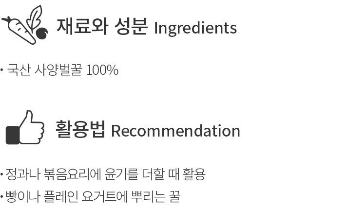 다채로운 요리나 디저트에 단맛을 더하고 싶을 때 활용하기 좋은 꿀 상품을 소개할게요. 부드러운 질감과 달콤한 맛이 매력적인 사양벌꿀인데요. 각종 요리나 정과에 윤기를 더할 때,요거트나 디저트에 가미할 시럽이 필요할 때,언제든 간편하게 활용하기에 제격이랍니다. 1kg의 넉넉한 용량으로 준비했으니,달콤함이 필요한 순간 필요한 만큼 담아낸 뒤 다채롭게 사용해보세요.