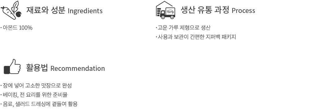 밀가루는 주방에서 빼놓을 수 없는 식재료인데요. 여러가지 이유로 밀가루 섭취가 부담스러운 분들을 위해,밀가루대신이 아몬드가루를 준비했어요. 오로지 아몬드만을 사용해 고운 분말 제형으로 만든 상품이에요. 된장,고추장 등에 넣어 걸죽한 맛장을 만들거나 베이킹,전 요리에 다채롭게 활용해도 좋고요. 물에 분말을 알맞게 풀어 아몬드 음료로 마셔도 간편하답니다.