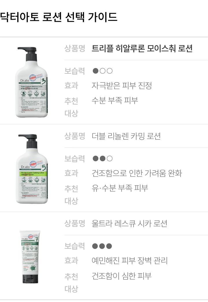 연약한 아이 피부부터 민감함으로 고민하는 피부까지,닥터아토의 로션으로 촉촉하게 다스려보세요. 엄마 뱃속에서 아이를 지켜주던 태지를 닮은 특허 성분*을 함유했어요. 그중 트리플 히알루론 모이스춰 로션은 3중 히알루론산을 담아 건조해진 피부에 수분을 촘촘하게 채워주고요. 자극받은 피부를 편안하게 다독여줍니다. 수분감이 가득 느껴지는 가벼운 로션 제형이니 데일리로 부담 없이 사용하기 좋을 거예요.