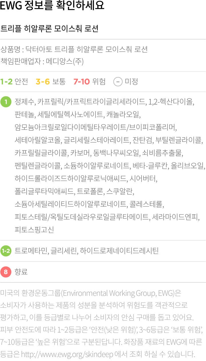 컬리는 EWG로부터 보통,위험 등급을 받은 성분이라 하더라도 숨기지 않고 정직하게 공개합니다. 더불어 우려되는 성분에 대한 정보를 함께 제공해 드리오니 구입 전 반드시 확인해 주세요.