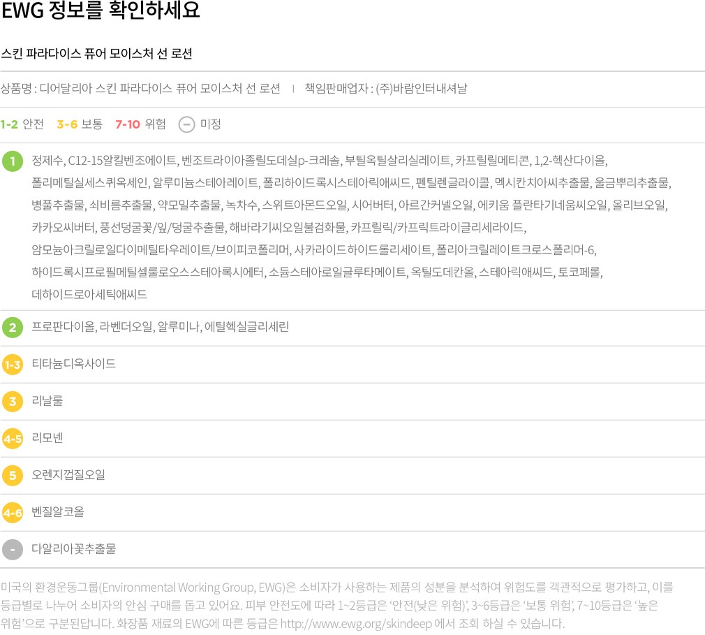 컬리는 EWG로부터 보통,위험 등급을 받은 성분이라 하더라도 숨기지 않고 정직하게 공개합니다. 더불어 우려되는 성분에 대한 정보를 함께 제공해 드리오니 구입 전 반드시 확인해 주세요.