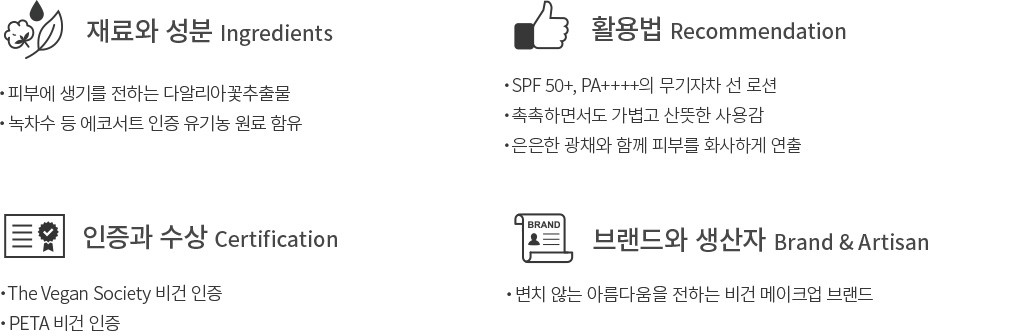 ・ 사용감:부드럽게 펴발리고 끈적임 없이 산뜻하게 흡수돼요. 은은한 광채와 함께 피부를 화사하게 연출해줍니다.