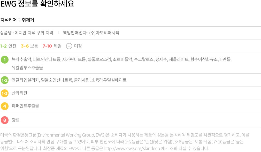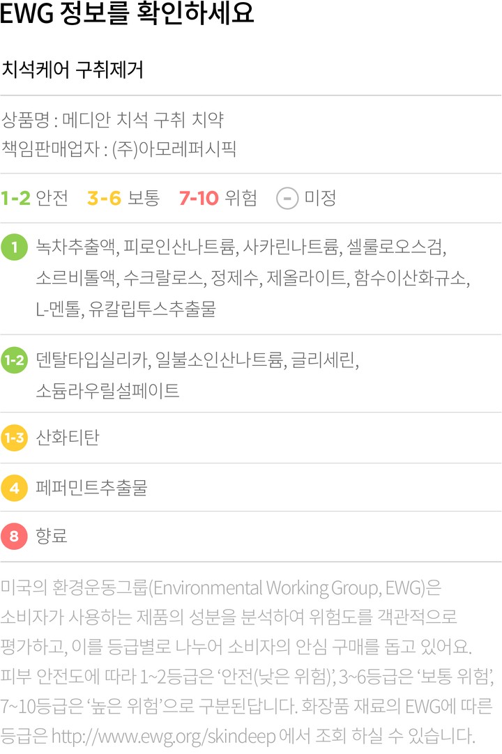 EWG에 대한 컬리의 생각 컬리는 화장품,샴푸,치약,세제 등 우리의 인체에 닿는 리빙 제품의 전성분을 공개하고 성분의 위험 정도를 EWG 기준에 따라 1~10 숫자로 안내하고 있습니다. EWG가 세계적으로 널리 사용되는 신뢰할 수 있는 척도인 것은 맞지만,상품의 안전성을 증명하는 절대적인 기준은 아니에요. EWG로부터 좋지 못한 평가를 받은 성분에 대해 전문가와 유관기관은 '권고 기준치를 지켜 사용할 경우 무해하다'고 평가하기도 합니다. 이에 컬리는 EWG 등급과 인터넷에 떠도는 단편적인 정보에만 의존하지 않고 식품의약품안전처,에코서트(ECOCERT),미국식품의약국(FDA),미국화장품원료검토위원회(CIR)등 공신력 있는 인증기관의 의견을 참고하여 유해성 여부를 꼼꼼하게 따져 보고 있습니다.