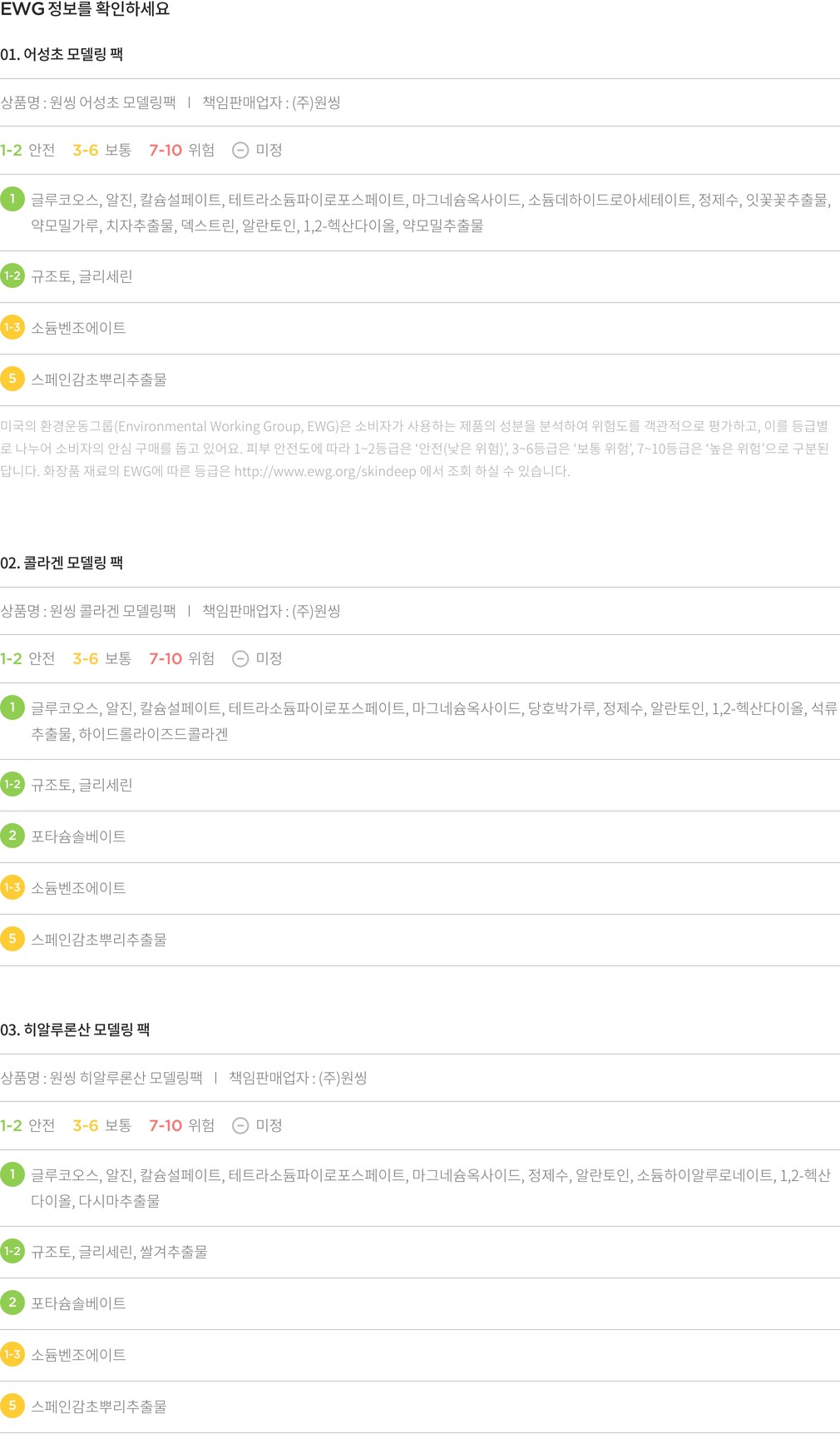 [원씽] 모델링 팩 20g*7개입 (7회분) 3종 (어성초 / 히알루론산 / 콜라겐) (택1)