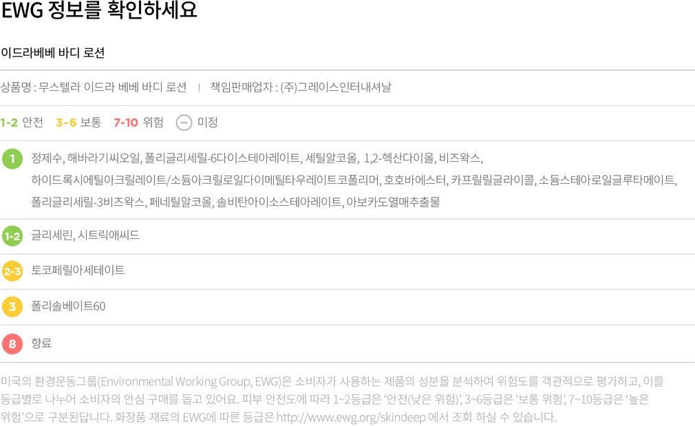 EWG에 대한 컬리의 생각 컬리는 화장품,샴푸,치약,세제 등 우리의 인체에 닿는 리빙 제품의 전성분을 공개하고 성분의 위험 정도를 EWG 기준에 따라 1~10 숫자로 안내하고 있습니다. EWG가 세계적으로 널리 사용되는 신뢰할 수 있는 척도인 것은 맞지만,상품의 안전성을 증명하는 절대적인 기준은 아니에요. EWG로부터 좋지 못한 평가를 받은 성분에 대해 전문가와 유관기관은 '권고 기준치를 지켜 사용할 경우 무해하다'고 평가하기도 합니다. 이에 컬리는 EWG 등급과 인터넷에 떠도는 단편적인 정보에만 의존하지 않고 식품의약품안전처,에코서트(ECOCERT),미국식품의약국(FDA),미국화장품원료검토위원회(CIR)등 공신력 있는 인증기관의 의견을 참고하여 유해성 여부를 꼼꼼하게 따져 보고 있습니다.