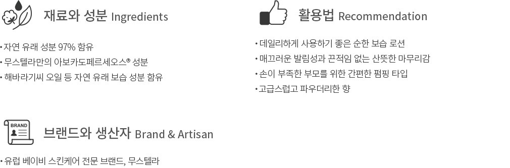 무스텔라는 수십 년간 신생아와 유아의 피부를 지켜줄 성분을 찾기 위해 면밀한 연구를 거듭해왔어요. 그 끝에 발견한 답은,바로 패키지에 그려진 아보카도였다고 해요. 무스텔라의 데일리용 일반 피부 라인에는 모두 아보카도페르세오스®성분이 들어있어요. 수분을 채워주고 피부 밸런스를 유지해주면서,장벽을 보호해주죠. 지금 소개하는 이드라베베 바디 로션은 무스텔라 제품 중에서도 베스트 셀러로 꼽히는데요. 끈적임 없이 흡수되어 금세 촉촉하고 부들부들해진 피부를 만날 수 있게 해준답니다. 간편하게 눌러 짜서 아이 몸에 부드럽게 펴 발라주세요.