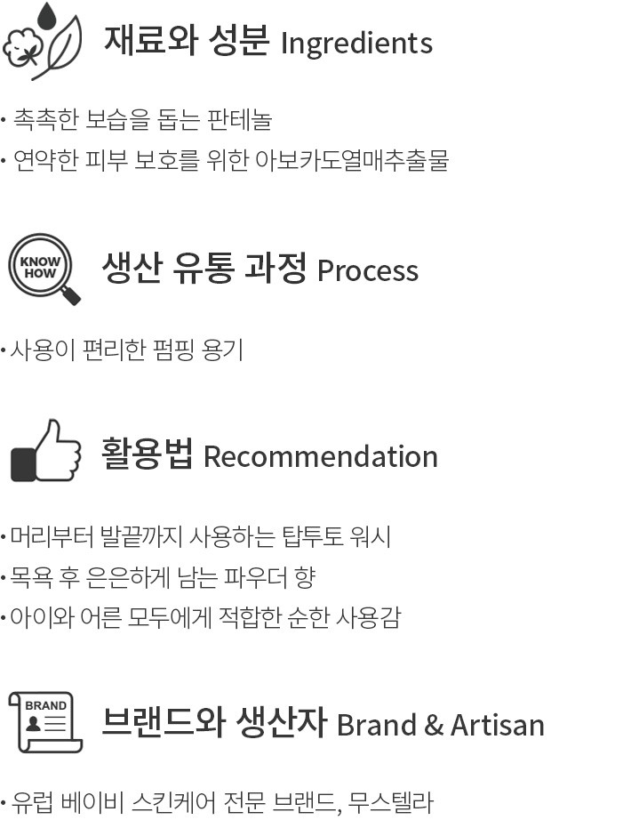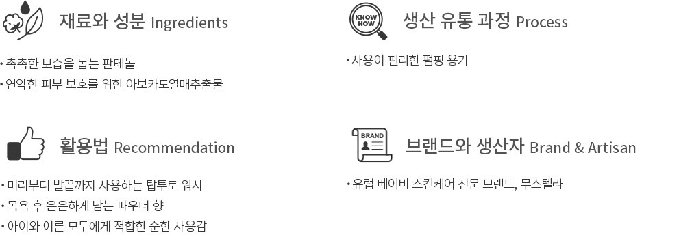 베이비 스킨케어 전문 브랜드 무스텔라의 베스트 셀러인 젠틀 클렌징 젤을 소개할게요. 머리부터 발끝까지 깨끗한 세정을 위한 올인원 워시 제품으로,특히 아이를 목욕시킬 때 무척 유용할 거예요. 성분 또한 꼼꼼하게 챙겨 판테놀과 아보카도열매추출물을 담았는데요. 샤워 후에 보습막이 씌워진 듯한 촉촉함을 선사한답니다. 미끈미끈한 젤을 씻어낸 자리에 은은한 파우더 잔향만 남아 아이는 물론,어른의 마음에도 쏙 들 거예요.