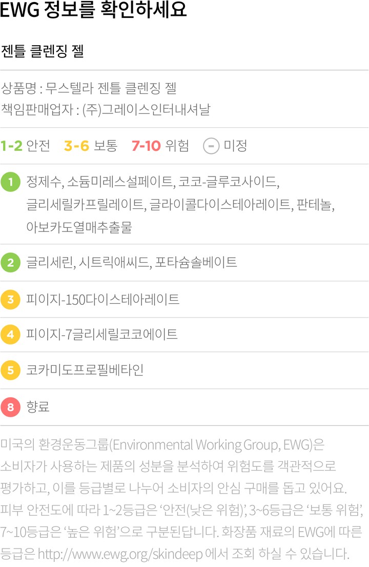 컬리는 EWG로부터 보통,위험 등급을 받은 성분이라 하더라도 숨기지 않고 정직하게 공개합니다. 더불어 우려되는 성분에 대한 정보를 함께 제공해 드리오니 구입 전 반드시 확인해 주세요.
