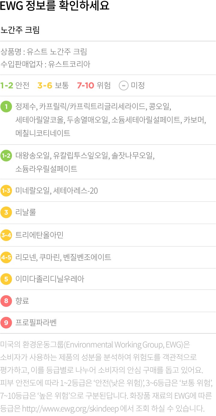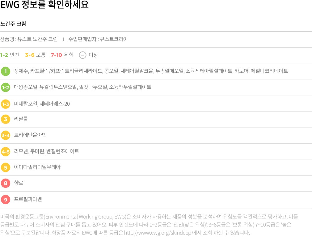 EWG에 대한 컬리의 생각 컬리는 화장품,샴푸,치약,세제 등 우리의 인체에 닿는 리빙 제품의 전성분을 공개하고 성분의 위험 정도를 EWG 기준에 따라 1~10 숫자로 안내하고 있습니다. EWG가 세계적으로 널리 사용되는 신뢰할 수 있는 척도인 것은 맞지만,상품의 안전성을 증명하는 절대적인 기준은 아니에요. EWG로부터 좋지 못한 평가를 받은 성분에 대해 전문가와 유관기관은 '권고 기준치를 지켜 사용할 경우 무해하다'고 평가하기도 합니다. 이에 컬리는 EWG 등급과 인터넷에 떠도는 단편적인 정보에만 의존하지 않고 식품의약품안전처,에코서트(ECOCERT),미국식품의약국(FDA),미국화장품원료검토위원회(CIR)등 공신력 있는 인증기관의 의견을 참고하여 유해성 여부를 꼼꼼하게 따져 보고 있습니다.