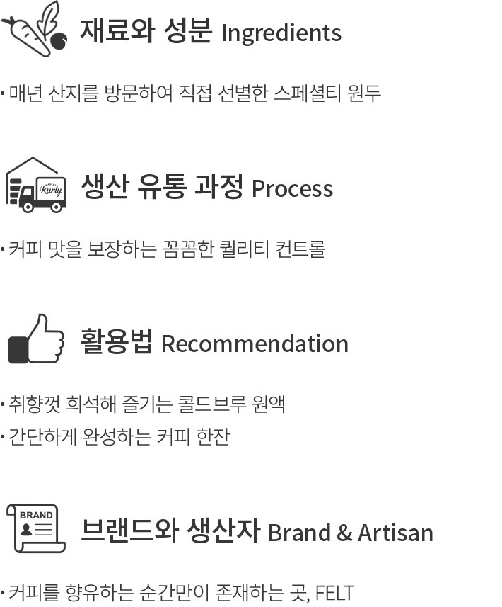 펠트는 커피 한잔에 담긴 수많은 과정과 이를 느끼는 순간에 주목하는 로스터리입니다. 오로지 커피에만 집중할 수 있는 공간을 제공하며 일상을 물들일 수 있는 좋은 커피를 선보이고 있죠. 창전동의 작은 쇼룸에서 시작된 펠트는,이제는 광화문과 도산공원 등에서도 만날 수 있는데요. 생두를 선택하는 그린빈 바이어부터 커피의 품질을 감정하는 커퍼,그리고 섬세한 맛의 차이를 완성하는 로스터와 바리스타까지. 펠트의 모든 구성원은 프로페셔널한 커피 전문가로 구성되어 있답니다. 꼼꼼한 퀄리티 컨트롤로 완성되는 펠트만의 스페셜티 커피,이제 컬리에서 만나 보세요.