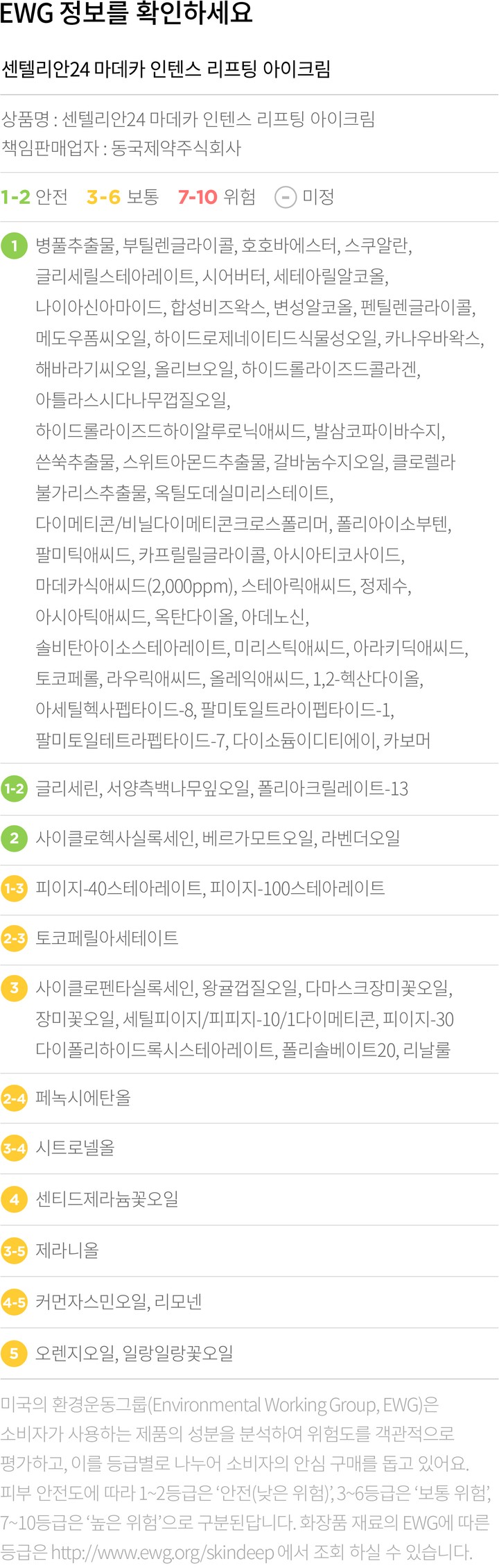 컬리는 EWG로부터 보통,위험 등급을 받은 성분이라 하더라도 숨기지 않고 정직하게 공개합니다. 더불어 우려되는 성분에 대한 정보를 함께 제공해 드리오니 구입 전 반드시 확인해 주세요.
