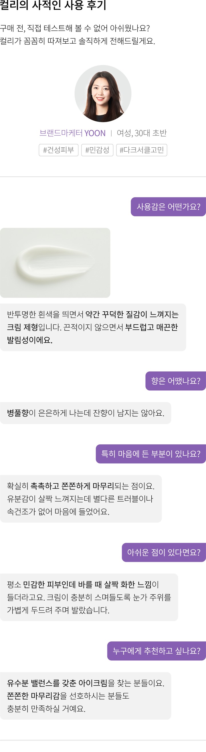 정성껏 관리하는 눈가 주름,센텔라아시아티카 정량추출물(TECA)*을 담은 아이크림으로 시작해 보세요. 살짝 꾸덕한 크림 제형이지만 촉촉하고 부드러운 발림성을 갖추었어요. 여기에 탄력에 도움을 주는 아세틸헥사펩타이드-8 등 펩타이드 계열 성분도 고루 챙겨 넣었답니다. 딱 필요한 만큼의 유분기도 품고 있으니 매일 눈가에 발라 진한 보습감을 얹어 보세요.