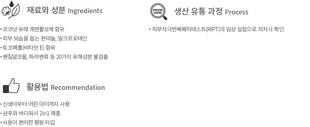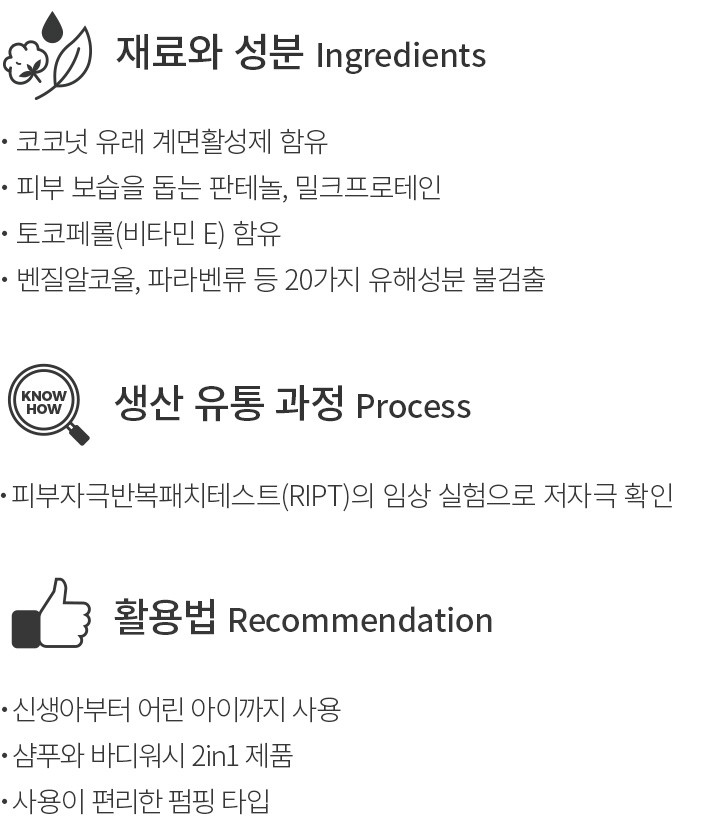・특징:신생아부터 어린 아이까지 사용하기 좋은 올인원 워시입니다. 전용 펌프 용기가 포함되어 있어요.