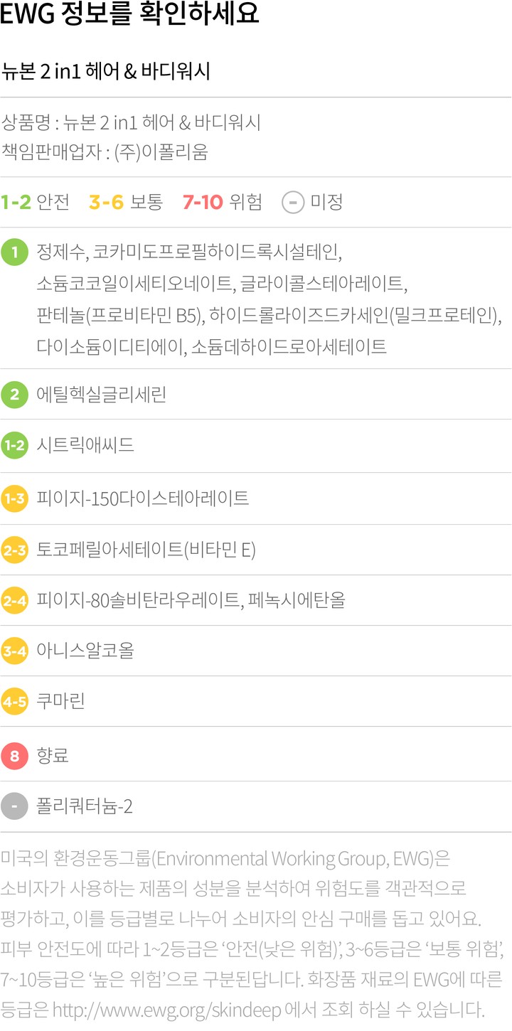 컬리는 EWG로부터 보통,위험 등급을 받은 성분이라 하더라도 숨기지 않고 정직하게 공개합니다. 더불어 우려되는 성분에 대한 정보를 함께 제공해 드리오니 구입 전 반드시 확인해 주세요.