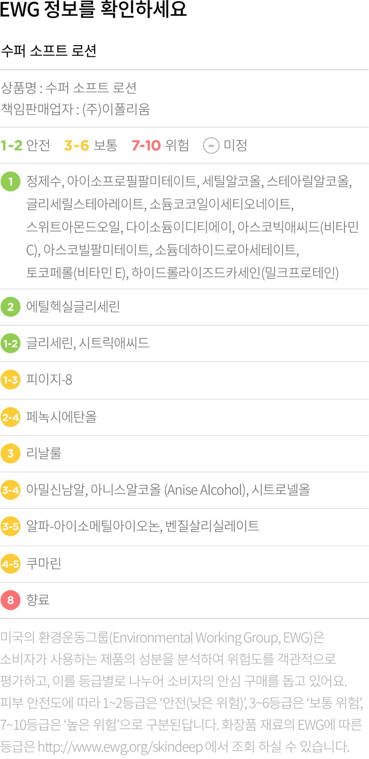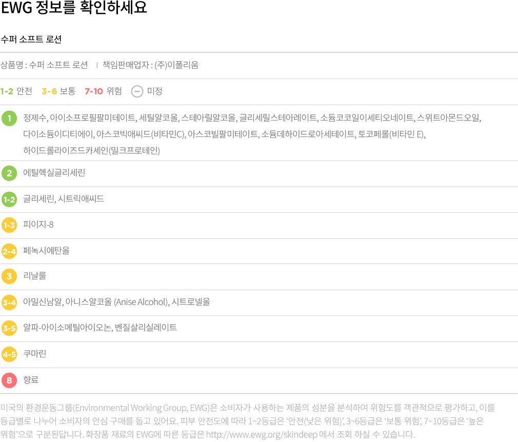 컬리는 EWG로부터 보통,위험 등급을 받은 성분이라 하더라도 숨기지 않고 정직하게 공개합니다. 더불어 우려되는 성분에 대한 정보를 함께 제공해 드리오니 구입 전 반드시 확인해 주세요.