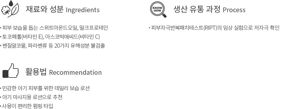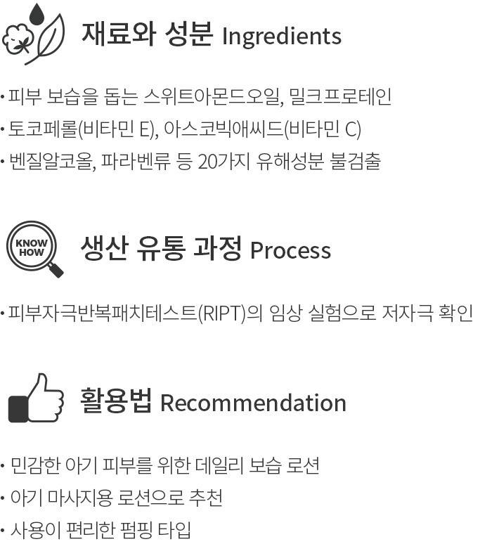 ・ 특징:촉촉한 보습력을 선사하는 베이비 로션입니다. 전용 펌프 용기가 포함되어 있어요.
