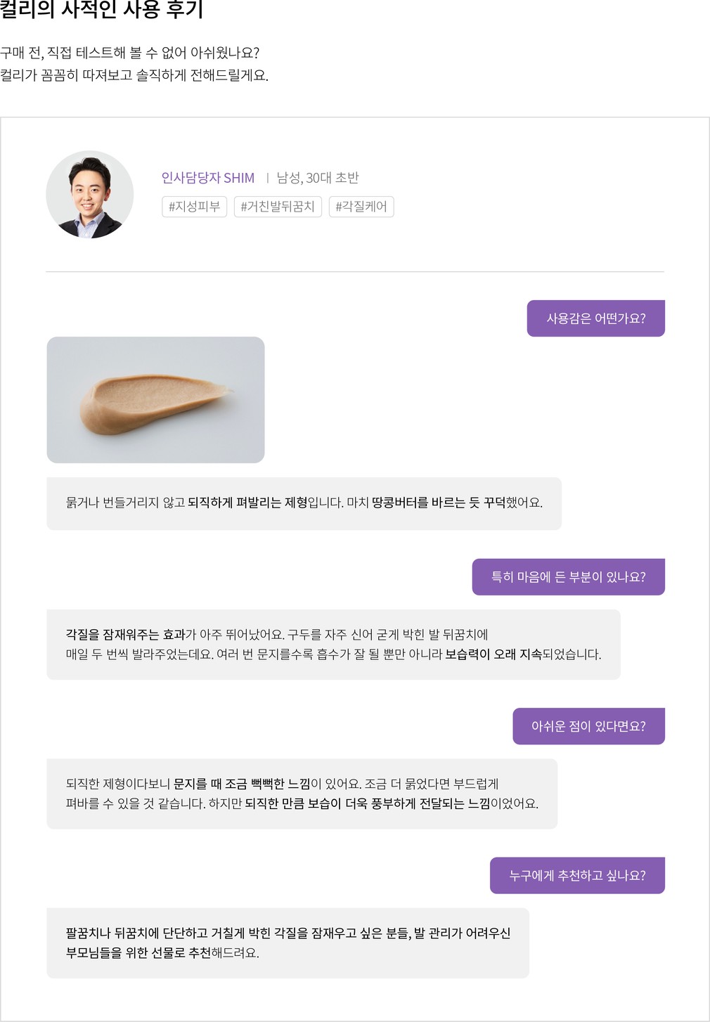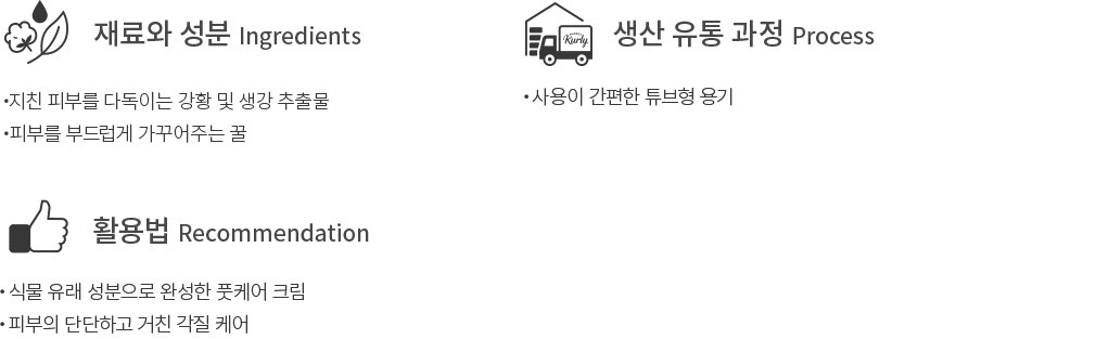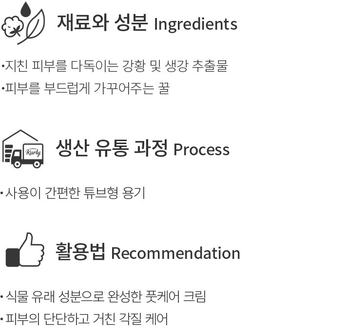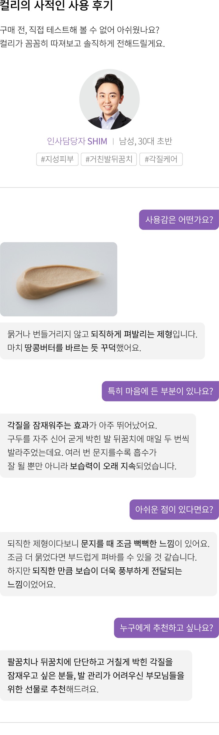 단단하고 거칠게 자리 잡은 각질을 보드랍게 잠재워줄 히말라야의 풋케어 크림을 소개할게요. 강황뿌리오일,꿀과 생강추출물 등 식물 유래 성분 5가지를 담아 완성한 제품인데요. 마치 버터를 펴바르는 듯 되직한 제형을 피부에 부드럽게 문질러주면 거친 각질에 촉촉하게 스며든답니다. 바른 후 피부를 다독이듯 여러 번 문질러보세요. 하얗게 일어난 각질이 촉촉하게 잦아들 거예요.