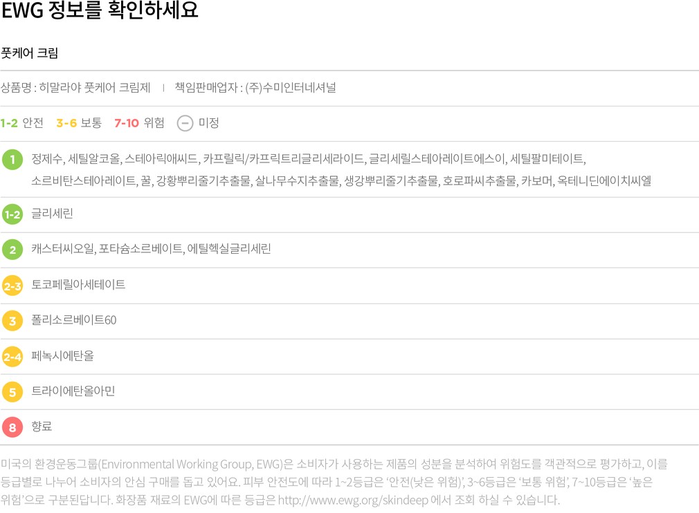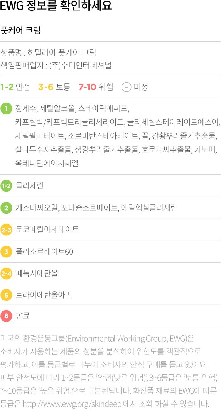 EWG에 대한 컬리의 생각 컬리는 화장품,샴푸,치약,세제 등 우리의 인체에 닿는 리빙 제품의 전성분을 공개하고 성분의 위험 정도를 EWG 기준에 따라 1~10 숫자로 안내하고 있습니다. EWG가 세계적으로 널리 사용되는 신뢰할 수 있는 척도인 것은 맞지만,상품의 안전성을 증명하는 절대적인 기준은 아니에요. EWG로부터 좋지 못한 평가를 받은 성분에 대해 전문가와 유관기관은 '권고 기준치를 지켜 사용할 경우 무해하다'고 평가하기도 합니다. 이에 컬리는 EWG 등급과 인터넷에 떠도는 단편적인 정보에만 의존하지 않고 식품의약품안전처,에코서트(ECOCERT),미국식품의약국(FDA),미국화장품원료검토위원회(CIR)등 공신력 있는 인증기관의 의견을 참고하여 유해성 여부를 꼼꼼하게 따져 보고 있습니다.