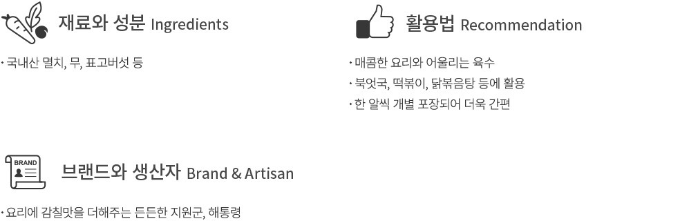 다시팩이나 천연 분말로 육수를 우려내는 것도 좋지만,가끔은 남은 다시팩을 버리고 다양한 분말을 조합하는 게 번거로울 때가 있어요. 그럴 땐 해통령의 육수한알을 물에 쏙 넣어 보세요. 국내산 멸치,다시마 등을 곱게 갈아 넣어 자연스러운 감칠맛이 일품이랍니다. 고춧가루를 더하지 않아도 칼칼한 맛이 제대로 우러나있고요. 시원한 콩나물국부터 떡볶이까지,깔끔하고 칼칼한 맛이 필요한 요리에 다양하게 활용해 보세요.