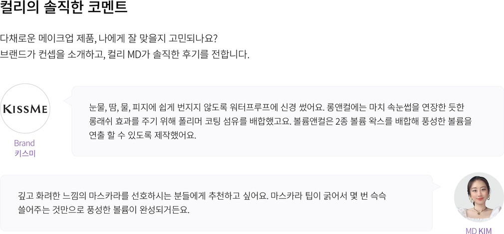 많은 이들의 화장대와 파우치에 빠지지 않는 아이 메이크업 브랜드,키스미를 이제 컬리에서 간편하게 만나보세요. 그중에서도 히로인메이크 마스카라는 그 이름처럼 만화 속 여주인공의 길고 풍성한 속눈썹을 연출해주는데요. 굴곡진 브러쉬가 속눈썹을 빈틈없이 감싸준답니다. 물과 땀에도 번짐 없이 덜한 워터프루프 제품이니 더욱 만족스러운 선택이 될 거예요.
