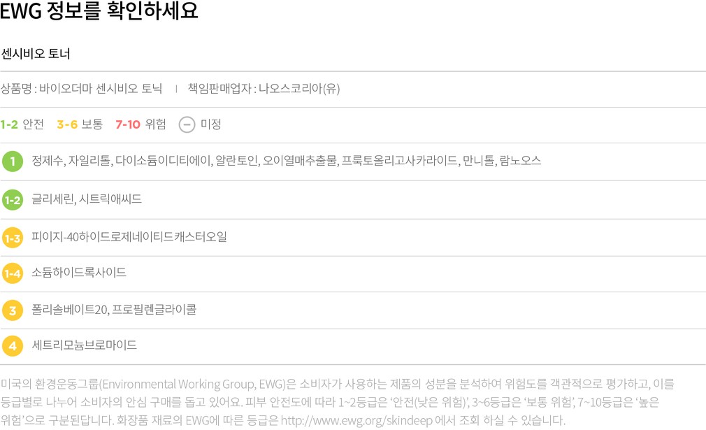 EWG에 대한 컬리의 생각 컬리는 화장품,샴푸,치약,세제 등 우리의 인체에 닿는 리빙 제품의 전성분을 공개하고 성분의 위험 정도를 EWG 기준에 따라 1~10 숫자로 안내하고 있습니다. EWG가 세계적으로 널리 사용되는 신뢰할 수 있는 척도인 것은 맞지만,상품의 안전성을 증명하는 절대적인 기준은 아니에요. EWG로부터 좋지 못한 평가를 받은 성분에 대해 전문가와 유관기관은 '권고 기준치를 지켜 사용할 경우 무해하다'고 평가하기도 합니다. 이에 컬리는 EWG 등급과 인터넷에 떠도는 단편적인 정보에만 의존하지 않고 식품의약품안전처,에코서트(ECOCERT),미국식품의약국(FDA),미국화장품원료검토위원회(CIR)등 공신력 있는 인증기관의 의견을 참고하여 유해성 여부를 꼼꼼하게 따져 보고 있습니다.