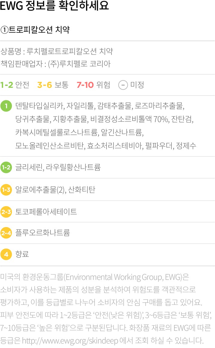 EWG에 대한 컬리의 생각 리는 화장품,샴푸,치약,세제 등 우리의 인체에 닿는 리빙 제품의 전성분을 공개하고 성분의 위험 정도를 EWG 기준에 따라 1~10 숫자로 안내하고 있습니다. EWG가 세계적으로 널리 사용되는 신뢰할 수 있는 척도인 것은 맞지만,상품의 안전성을 증명하는 절대적인 기준은 아니에요. EWG로부터 좋지 못한 평가를 받은 성분에 대해 전문가와 유관기관은 '권고 기준치를 지켜 사용할 경우 무해하다'고 평가하기도 합니다. 이에 컬리는 EWG 등급과 인터넷에 떠도는 단편적인 정보에만 의존하지 않고 식품의약품안전처,에코서트(ECOCERT),미국식품의약국(FDA),미국화장품원료검토위원회(CIR)등 공신력 있는 인증기관의 의견을 참고하여 유해성 여부를 꼼꼼하게 따져 보고 있습니다.
