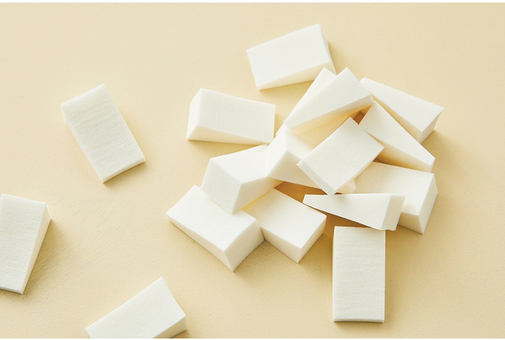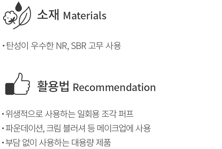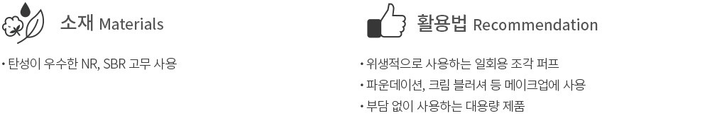 ・특징:파운데이션이나 크림 블러셔를 펴바를 때 사용하는 조각 퍼프입니다. 한 면씩 사용한 후 버리면 되는 일회용 퍼프로 더욱 위생적이에요.