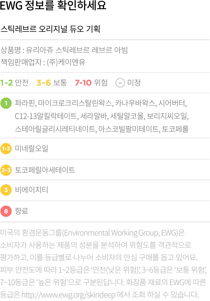컬리는 EWG로부터 보통,위험 등급을 받은 성분이라 하더라도 숨기지 않고 정직하게 공개합니다. 더불어 우려되는 성분에 대한 정보를 함께 제공해 드리오니 구입 전 반드시 확인해 주세요.