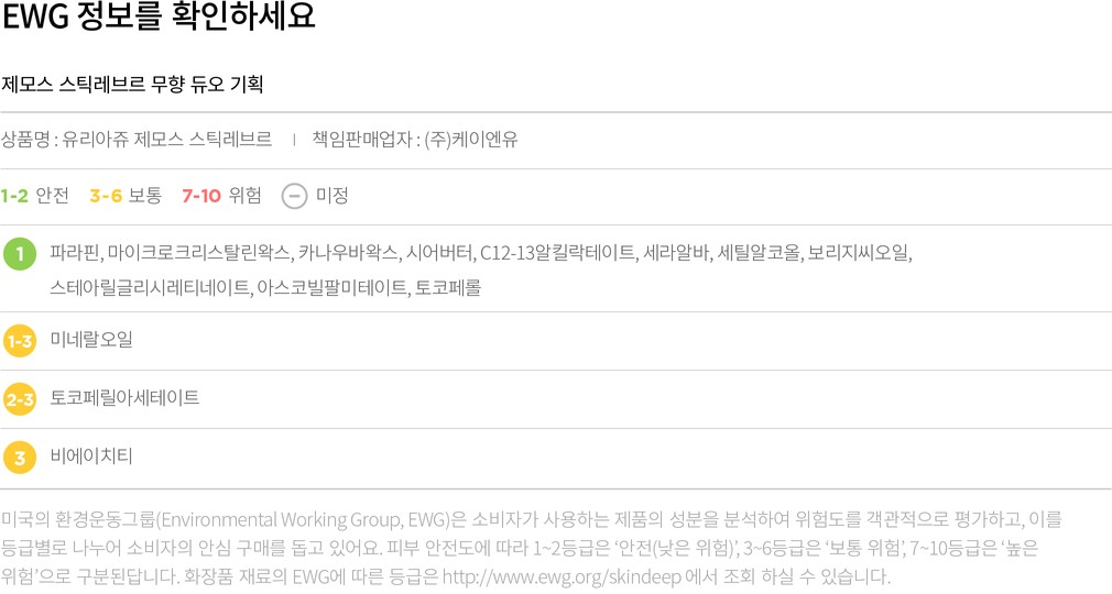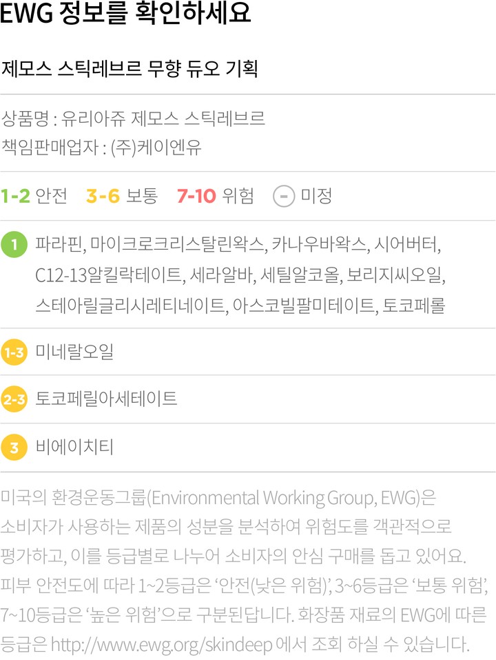 컬리는 EWG로부터 보통,위험 등급을 받은 성분이라 하더라도 숨기지 않고 정직하게 공개합니다. 더불어 우려되는 성분에 대한 정보를 함께 제공해 드리오니 구입 전 반드시 확인해 주세요.