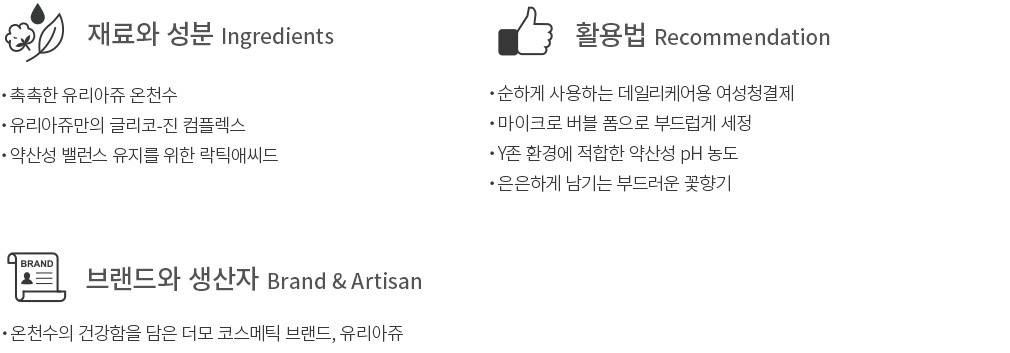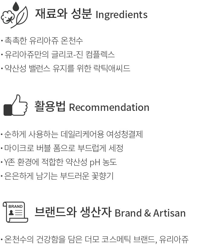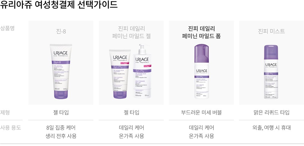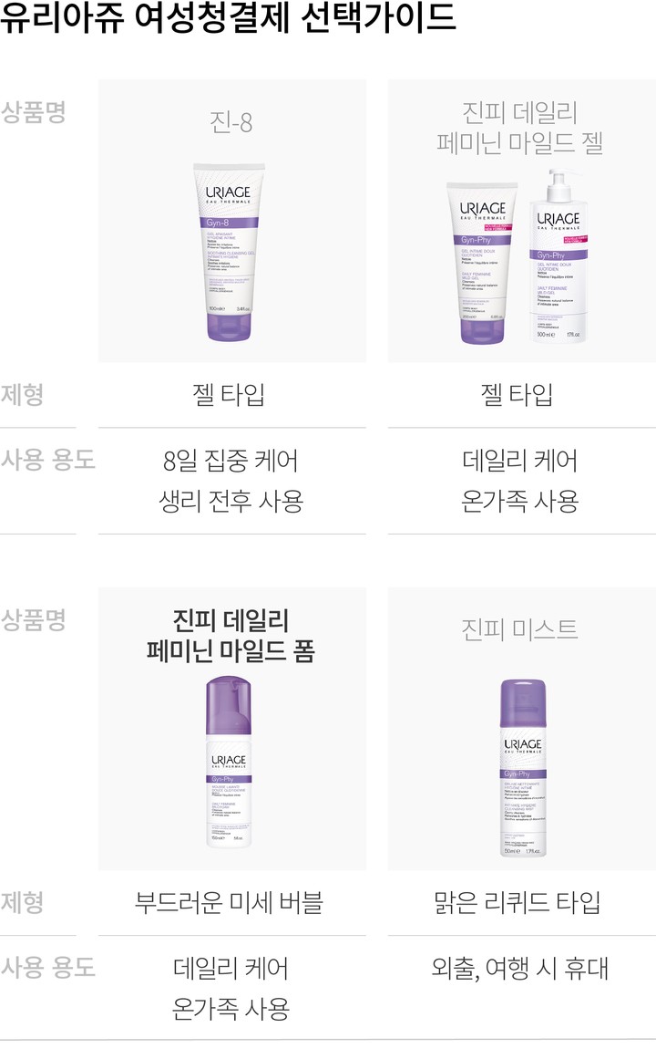 세정하는 것마저 불편하게 느껴지는 예민한 시기에는,피부에 부드럽게 와닿는 폼 타입의 여성청결제를 권할게요. 펌핑하는 즉시 풍성하고 크리미한 미세 버블이 생겨나기에 사용하기 무척 편안한 제품이에요. 유리아쥬만의 글리코-진 컴플렉스로 Y존을 부드럽게 세정할 수 있고요. 유리아쥬 온천수가 촉촉함과 편안함을 전해요. 매일 사용할 데일리용 제품으로 선택해도 좋습니다.