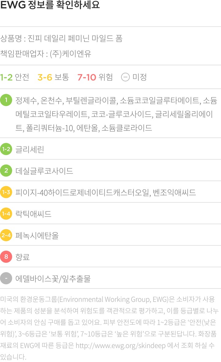 EWG에 대한 컬리의 생각 컬리는 화장품,샴푸,치약,세제 등 우리의 인체에 닿는 리빙 제품의 전성분을 공개하고 성분의 위험 정도를 EWG 기준에 따라 1~10 숫자로 안내하고 있습니다. EWG가 세계적으로 널리 사용되는 신뢰할 수 있는 척도인 것은 맞지만,상품의 안전성을 증명하는 절대적인 기준은 아니에요. EWG로부터 좋지 못한 평가를 받은 성분에 대해 전문가와 유관기관은 '권고 기준치를 지켜 사용할 경우 무해하다'고 평가하기도 합니다. 이에 컬리는 EWG 등급과 인터넷에 떠도는 단편적인 정보에만 의존하지 않고 식품의약품안전처,에코서트(ECOCERT),미국식품의약국(FDA),미국화장품원료검토위원회(CIR)등 공신력 있는 인증기관의 의견을 참고하여 유해성 여부를 꼼꼼하게 따져 보고 있습니다.