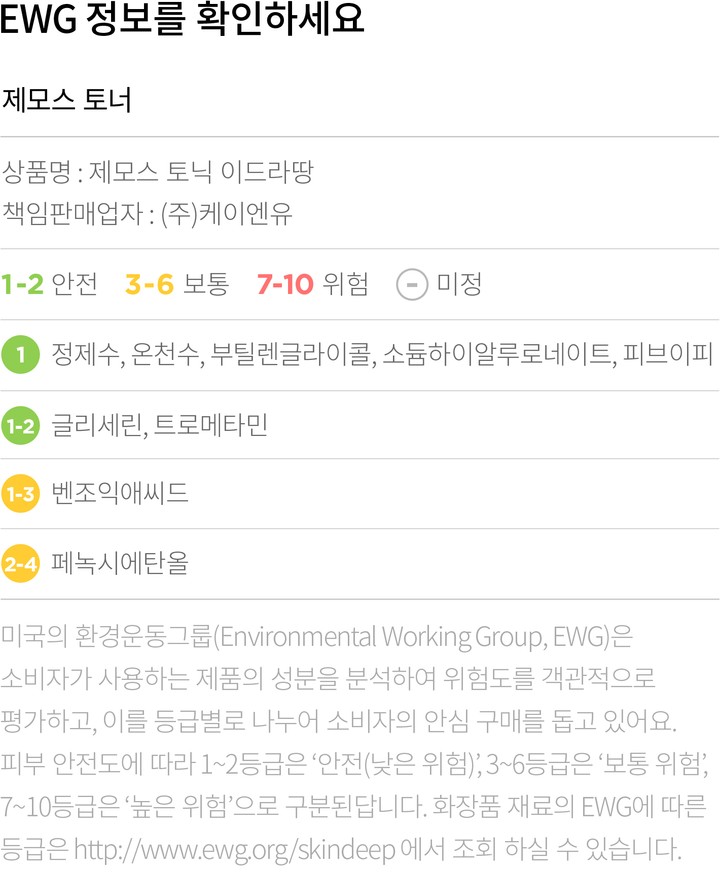 EWG에 대한 컬리의 생각 컬리는 화장품,샴푸,치약,세제 등 우리의 인체에 닿는 리빙 제품의 전성분을 공개하고 성분의 위험 정도를 EWG 기준에 따라 1~10 숫자로 안내하고 있습니다. EWG가 세계적으로 널리 사용되는 신뢰할 수 있는 척도인 것은 맞지만,상품의 안전성을 증명하는 절대적인 기준은 아니에요. EWG로부터 좋지 못한 평가를 받은 성분에 대해 전문가와 유관기관은 '권고 기준치를 지켜 사용할 경우 무해하다'고 평가하기도 합니다. 이에 컬리는 EWG 등급과 인터넷에 떠도는 단편적인 정보에만 의존하지 않고 식품의약품안전처,에코서트(ECOCERT),미국식품의약국(FDA),미국화장품원료검토위원회(CIR)등 공신력 있는 인증기관의 의견을 참고하여 유해성 여부를 꼼꼼하게 따져 보고 있습니다.