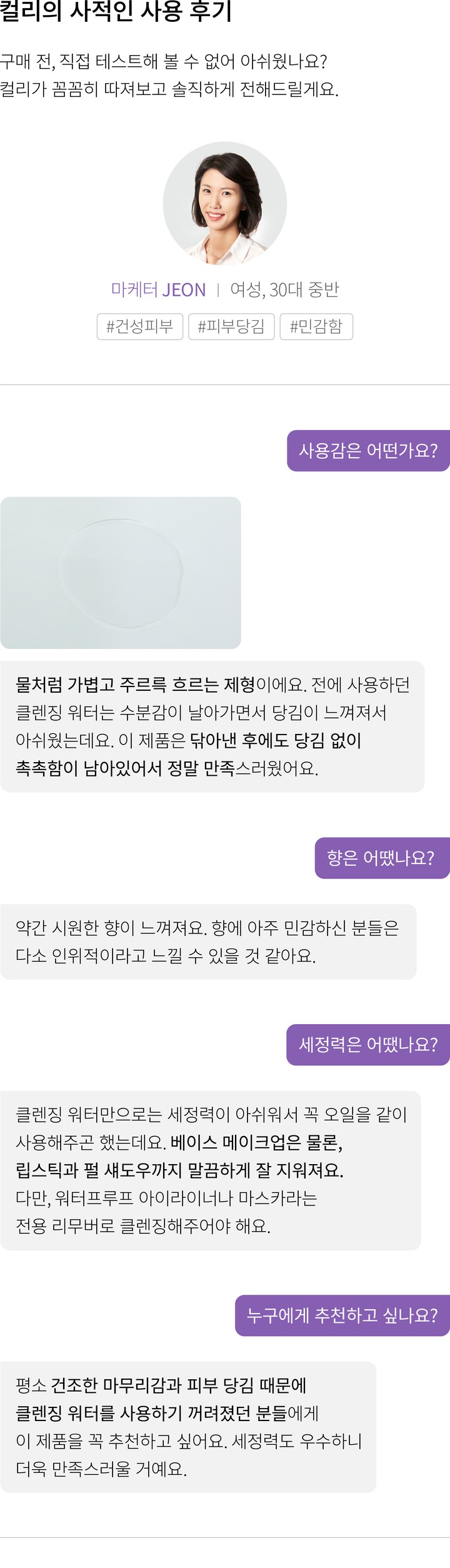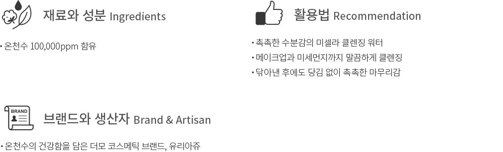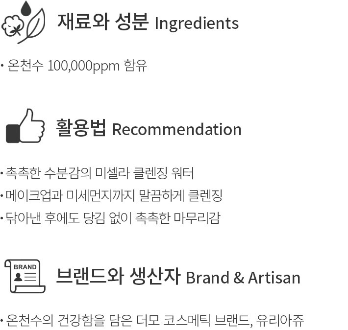 우수한 세정력은 물론 촉촉한 수분감을 지닌 유리아쥬의 미셀라 클렌징 워터를 소개할게요. 메이크업과 피부 노폐물은 물론,미세먼지 모사체까지 말끔하게 클렌징해줍니다. 온천수를 가득 담아 닦아낸 후에도 당김 없이 촉촉하게 마무리되죠. 듀오 세트로 준비했으니 가벼운 메이크업을 한 날이나 일상 속의 유해 환경이 걱정될 때에도 사용해보세요.