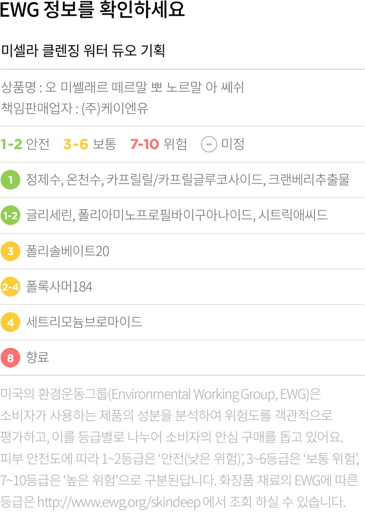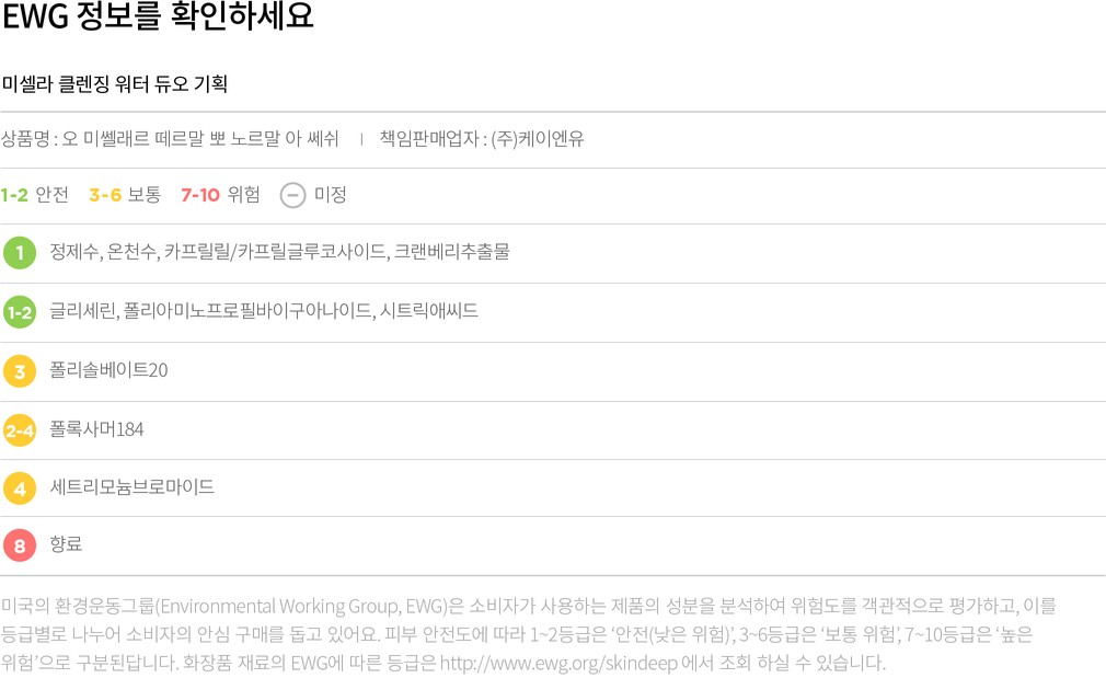 EWG에 대한 컬리의 생각 컬리는 화장품,샴푸,치약,세제 등 우리의 인체에 닿는 리빙 제품의 전성분을 공개하고 성분의 위험 정도를 EWG 기준에 따라 1~10 숫자로 안내하고 있습니다. EWG가 세계적으로 널리 사용되는 신뢰할 수 있는 척도인 것은 맞지만,상품의 안전성을 증명하는 절대적인 기준은 아니에요. EWG로부터 좋지 못한 평가를 받은 성분에 대해 전문가와 유관기관은 '권고 기준치를 지켜 사용할 경우 무해하다'고 평가하기도 합니다. 이에 컬리는 EWG 등급과 인터넷에 떠도는 단편적인 정보에만 의존하지 않고 식품의약품안전처,에코서트(ECOCERT),미국식품의약국(FDA),미국화장품원료검토위원회(CIR)등 공신력 있는 인증기관의 의견을 참고하여 유해성 여부를 꼼꼼하게 따져 보고 있습니다.