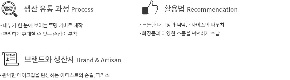 여행이나 외출 전 화장품을 챙길 때 혹시 몰라 이것저것 빠짐없이 담는 분들이 많을 거예요. 한정적인 수납력 때문에 고민이었다면 넉넉한 사이즈의 피카소 트레블 스퀘어 화장품 파우치를 만나보세요. 완벽한 메이크업을 위한 다양한 화장품부터 브러쉬,소품 등을 넉넉하게 수납할 수 있답니다. 튼튼한 내구성에 휴대가 편리한 손잡이까지 있으니 여기저기 부담 없이 들고 다니기 좋을 거예요.
