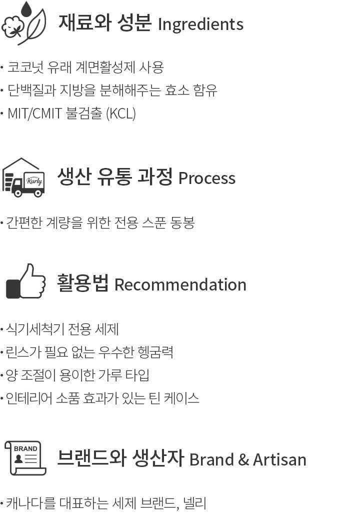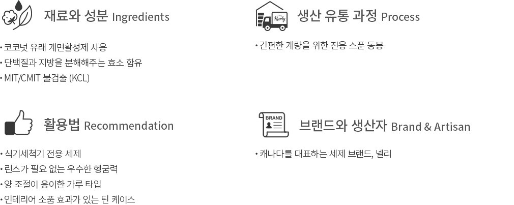 남김 없는 깨끗한 세정력을 보여주는 순수한 순백 넬리 세제. 사실은 세탁세제뿐 아니라 식기세척기 세제로서도 원조격으로 꼽힌답니다. 성분은 소다와 구연산 등 자연에서 유래한 성분들 위주라 안심하고 사용할 수 있고요. 그릇에 물얼룩이나 가루를 남기지 않고 뽀득뽀득하게 세척해줘요. 가루 타입이라 양을 조절하기도 편리할 거예요.