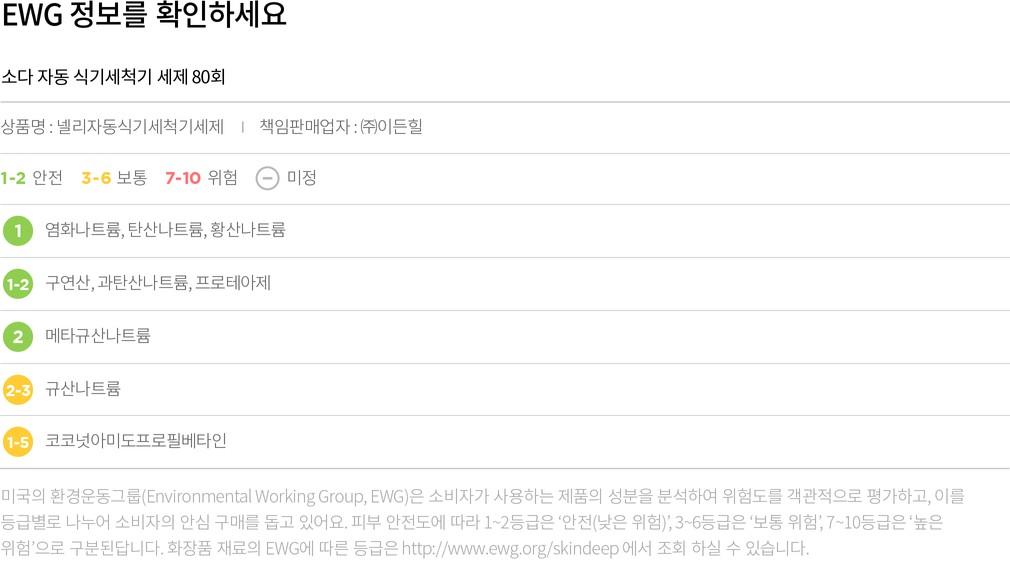 EWG에 대한 컬리의 생각 컬리는 화장품,샴푸,치약,세제 등 우리의 인체에 닿는 리빙 제품의 전성분을 공개하고 성분의 위험 정도를 EWG 기준에 따라 1~10 숫자로 안내하고 있습니다. EWG가 세계적으로 널리 사용되는 신뢰할 수 있는 척도인 것은 맞지만,상품의 안전성을 증명하는 절대적인 기준은 아니에요. EWG로부터 좋지 못한 평가를 받은 성분에 대해 전문가와 유관기관은 '권고 기준치를 지켜 사용할 경우 무해하다'고 평가하기도 합니다. 이에 컬리는 EWG 등급과 인터넷에 떠도는 단편적인 정보에만 의존하지 않고 식품의약품안전처,에코서트(ECOCERT),미국식품의약국(FDA),미국화장품원료검토위원회(CIR)등 공신력 있는 인증기관의 의견을 참고하여 유해성 여부를 꼼꼼하게 따져 보고 있습니다.