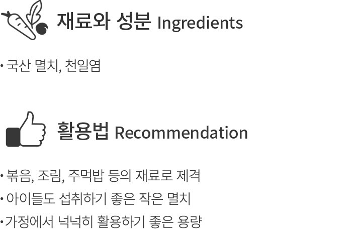고소하게 볶아낸 잔멸치는 바작바작 씹히는 식감이 무엇보다 매력적이죠. 이번에는 깨끗한 건해산물로 정직한 먹거리를 만드는 건어물상회의 볶음용 멸치를 소개할게요. 아이들도 먹기 좋은 크기의 작은 국산 멸치를 골라,약간의 천일염을 더해 간을 맞추었답니다. 달큰한 양념과 견과류를 더해 멸치볶음을 만들어도 좋고요. 아이들을 위한 주먹밥 재료로도 제격이랍니다.