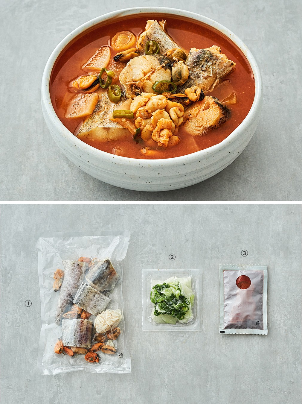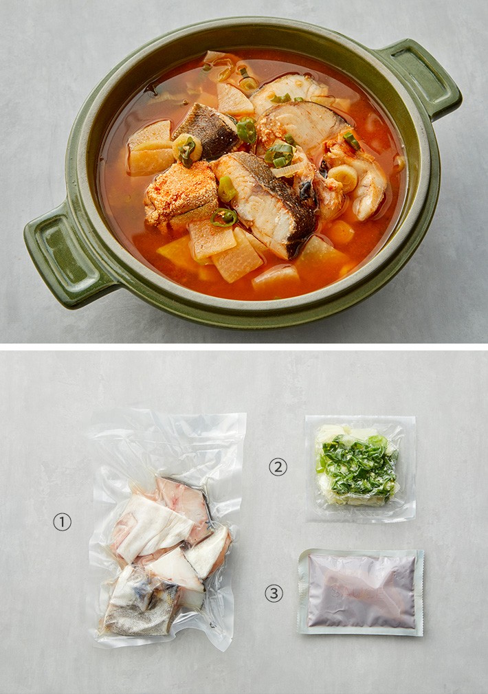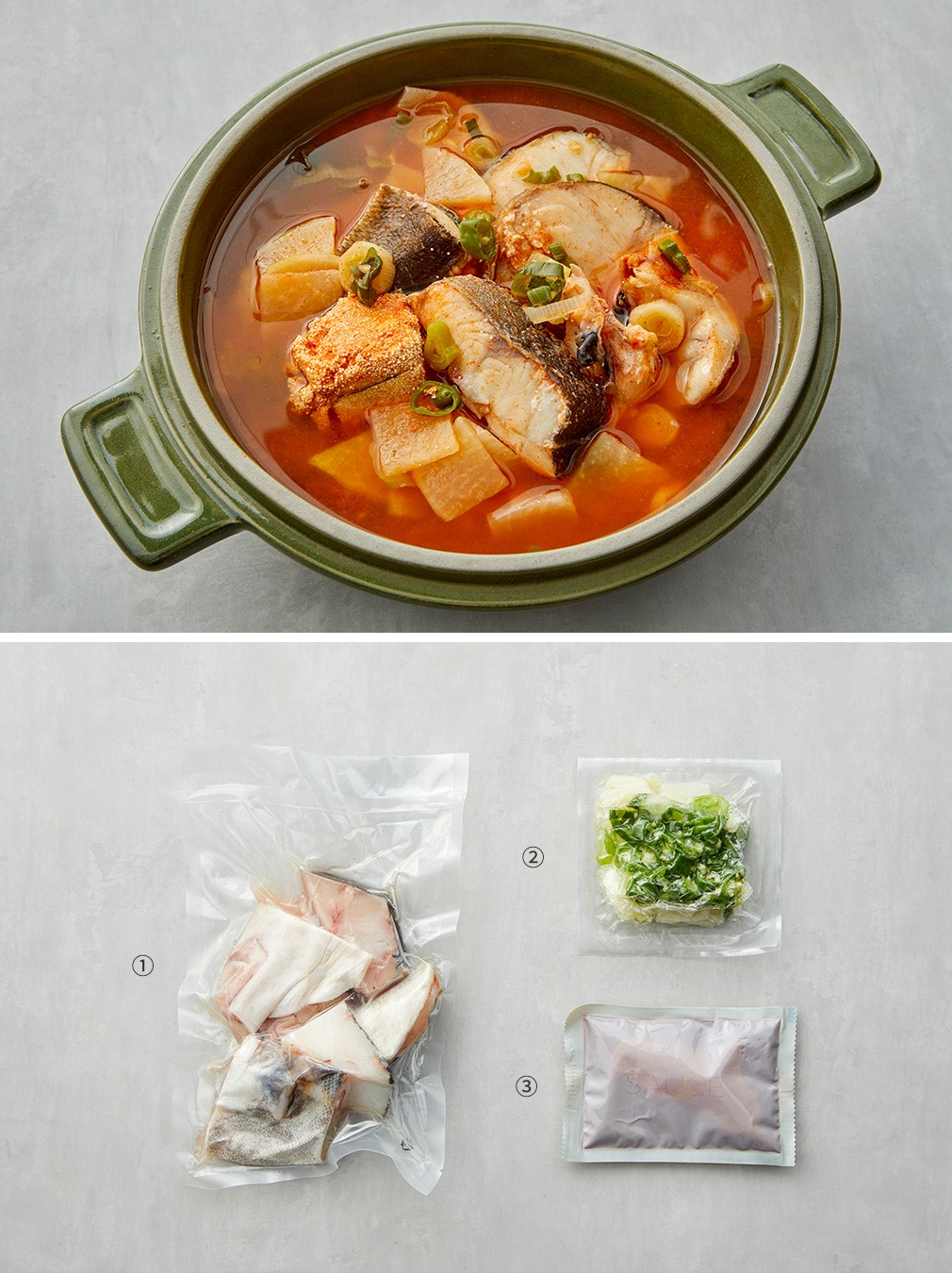 02. 속 시원한 대구 매운탕・구성:①대구,②채소(무,대파,청양고추),③양념 소스