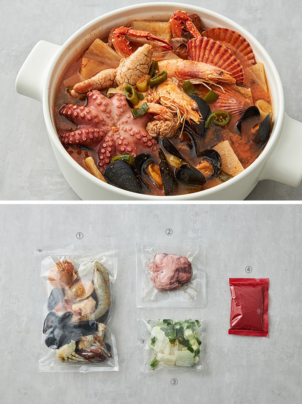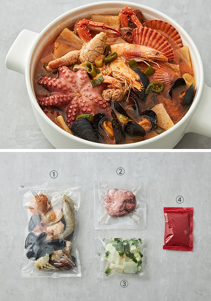 01. 알짜배기 문어해물탕・구성:①모둠 해물(홍가리비,꽃게,명태알,명태곤이,새우),②문어,③채소(무,대파,청양고추),④양념 소스